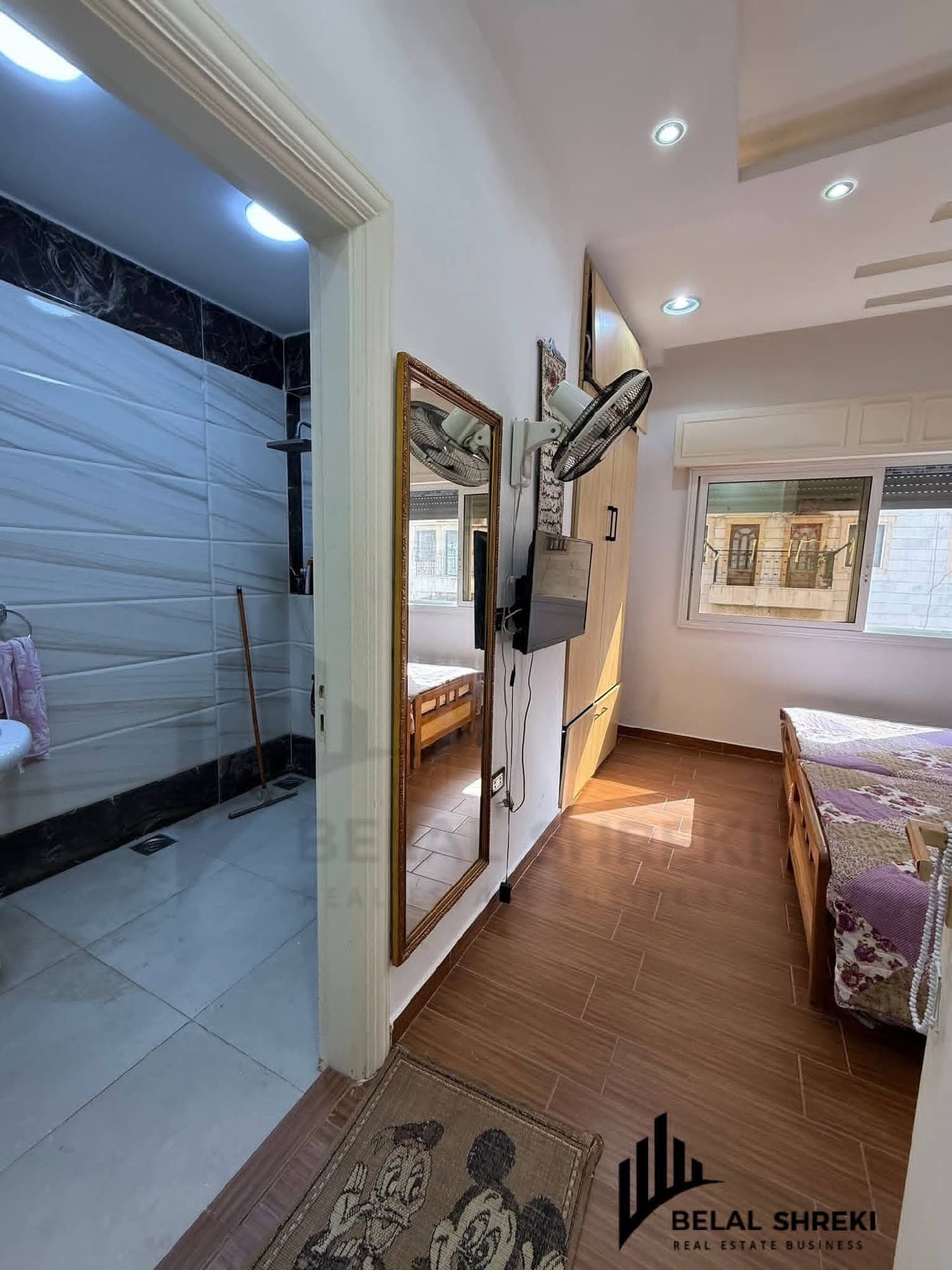 الشقة #مؤلفة من صالة استقبال وغرفة جلوس // مطبخ أميركي// غرفتين نوم ماستر// حمام // برندا على الشارع العام